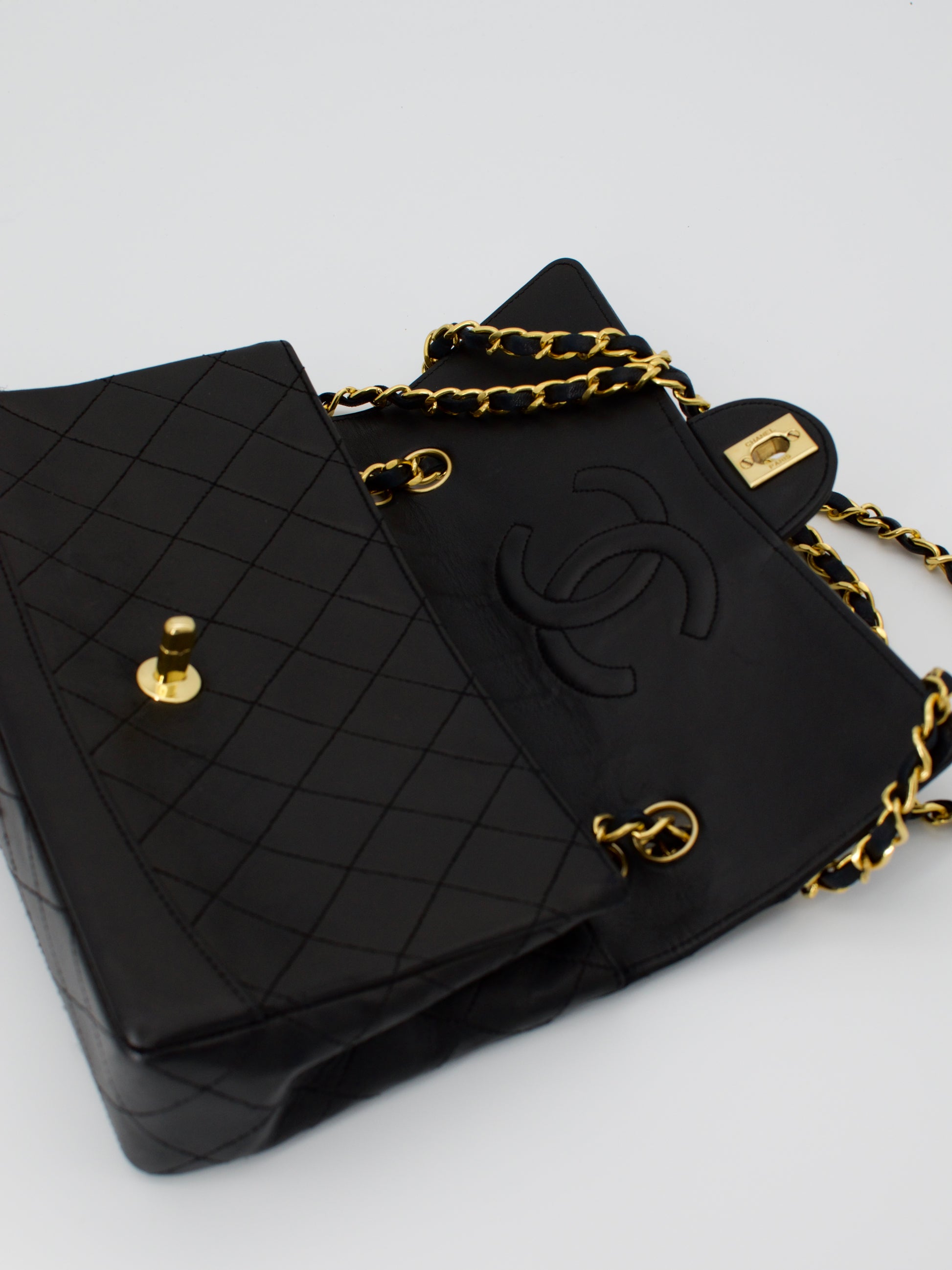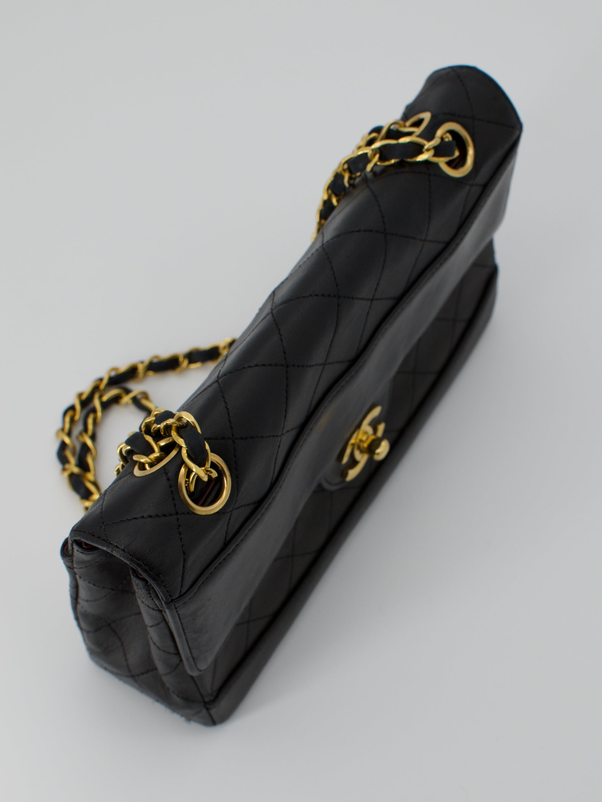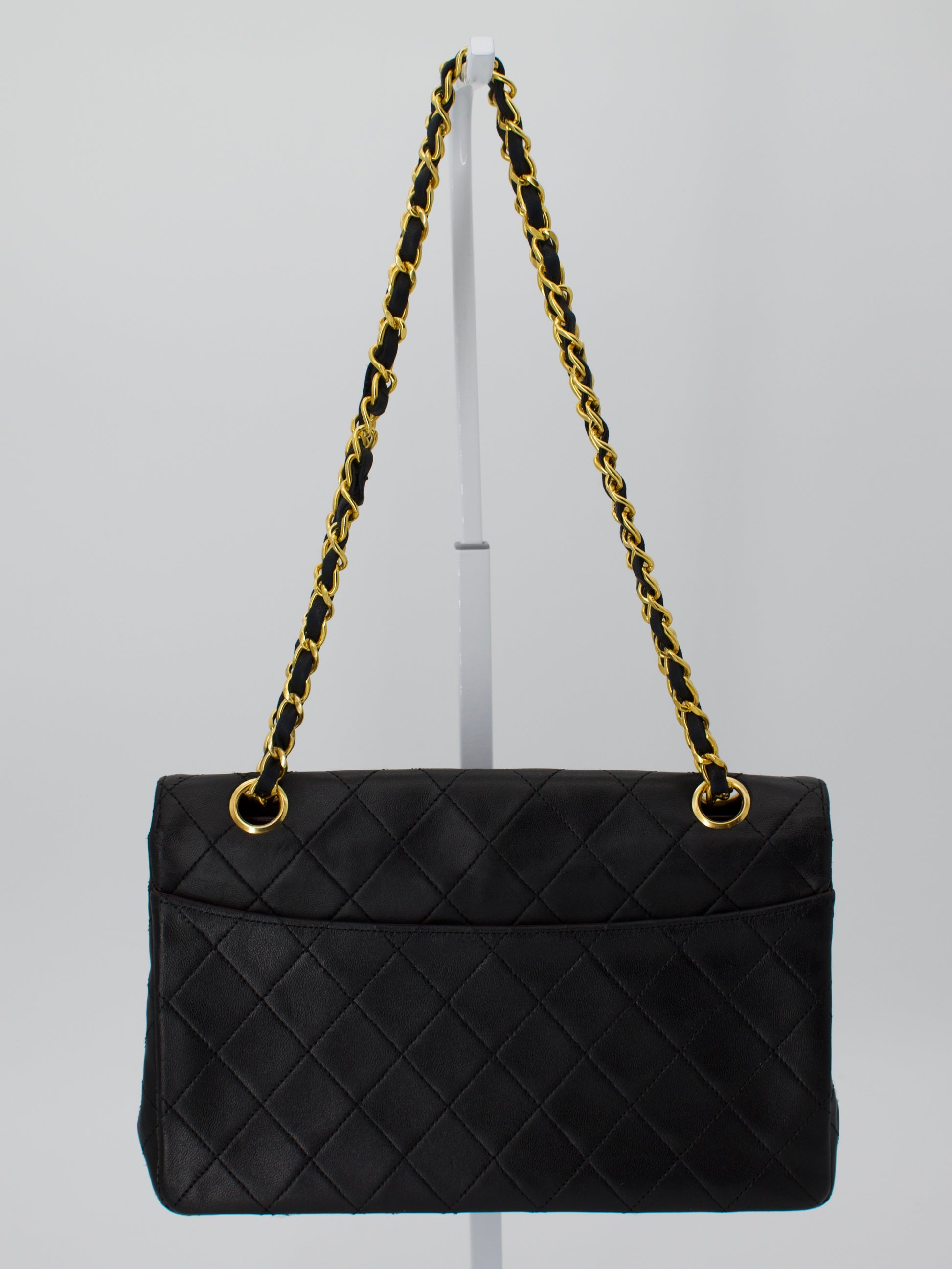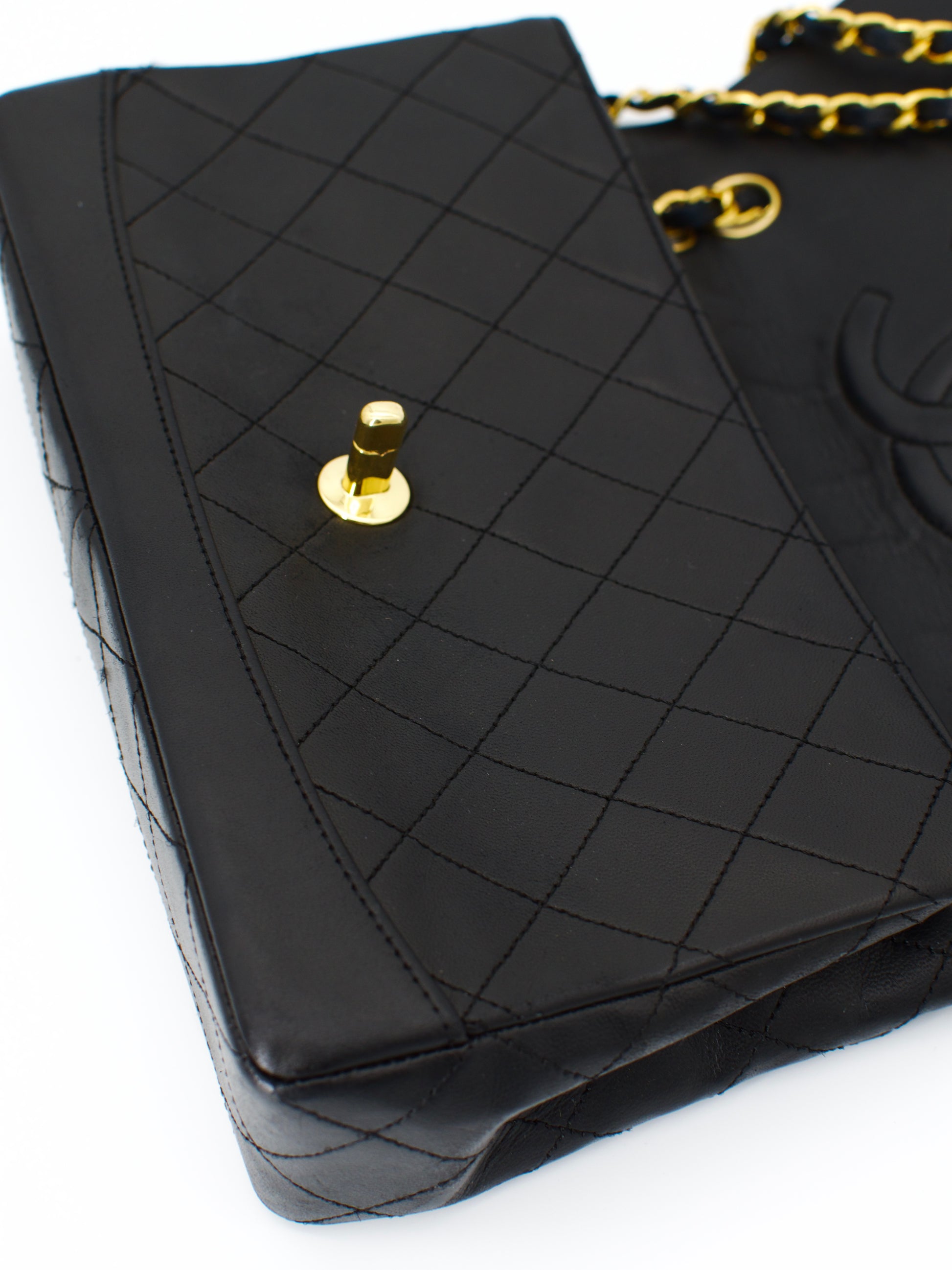 Crafted in supple black lambskin leather with signature diamond quilting, this vintage piece features distinctive details no longer found in current production—smooth leather piping along the flap edges and an exterior back pocket.