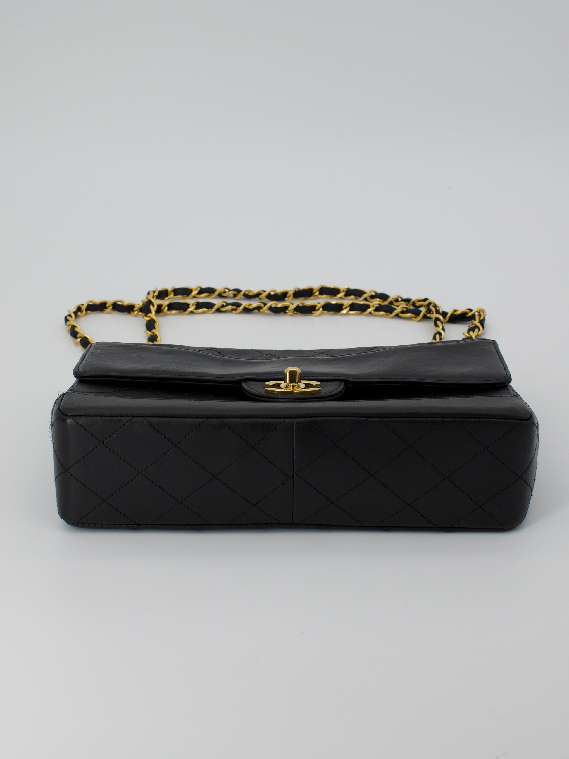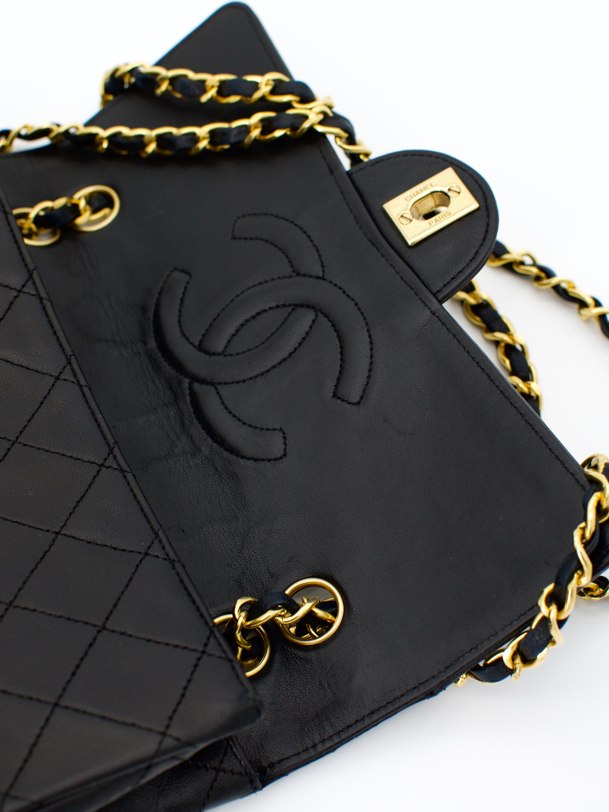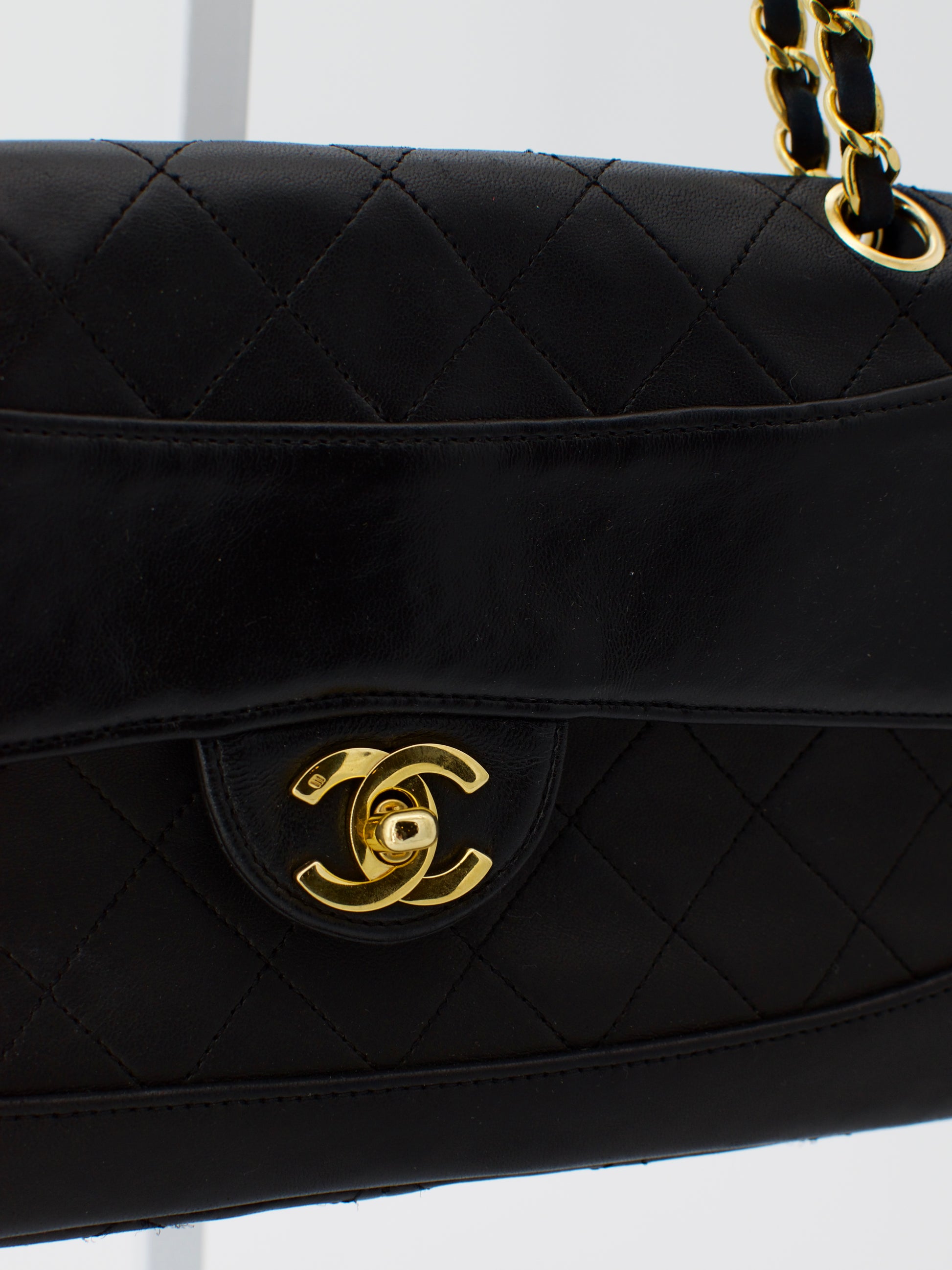 Crafted in supple black lambskin leather with signature diamond quilting, this vintage piece features distinctive details no longer found in current production—smooth leather piping along the flap edges and an exterior back pocket.