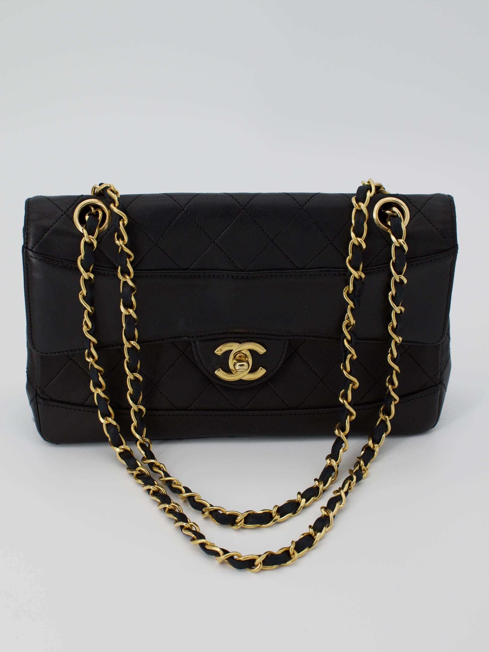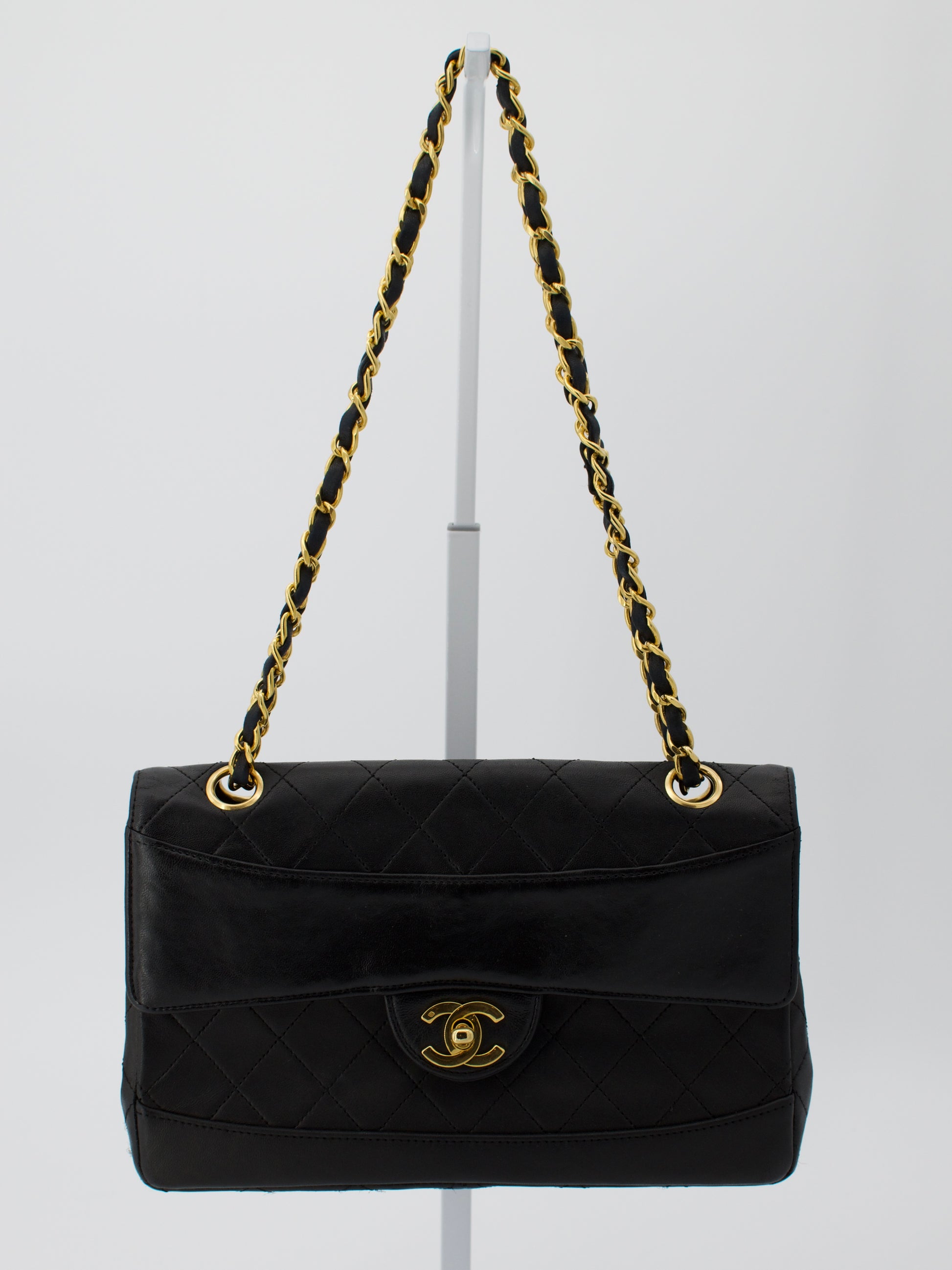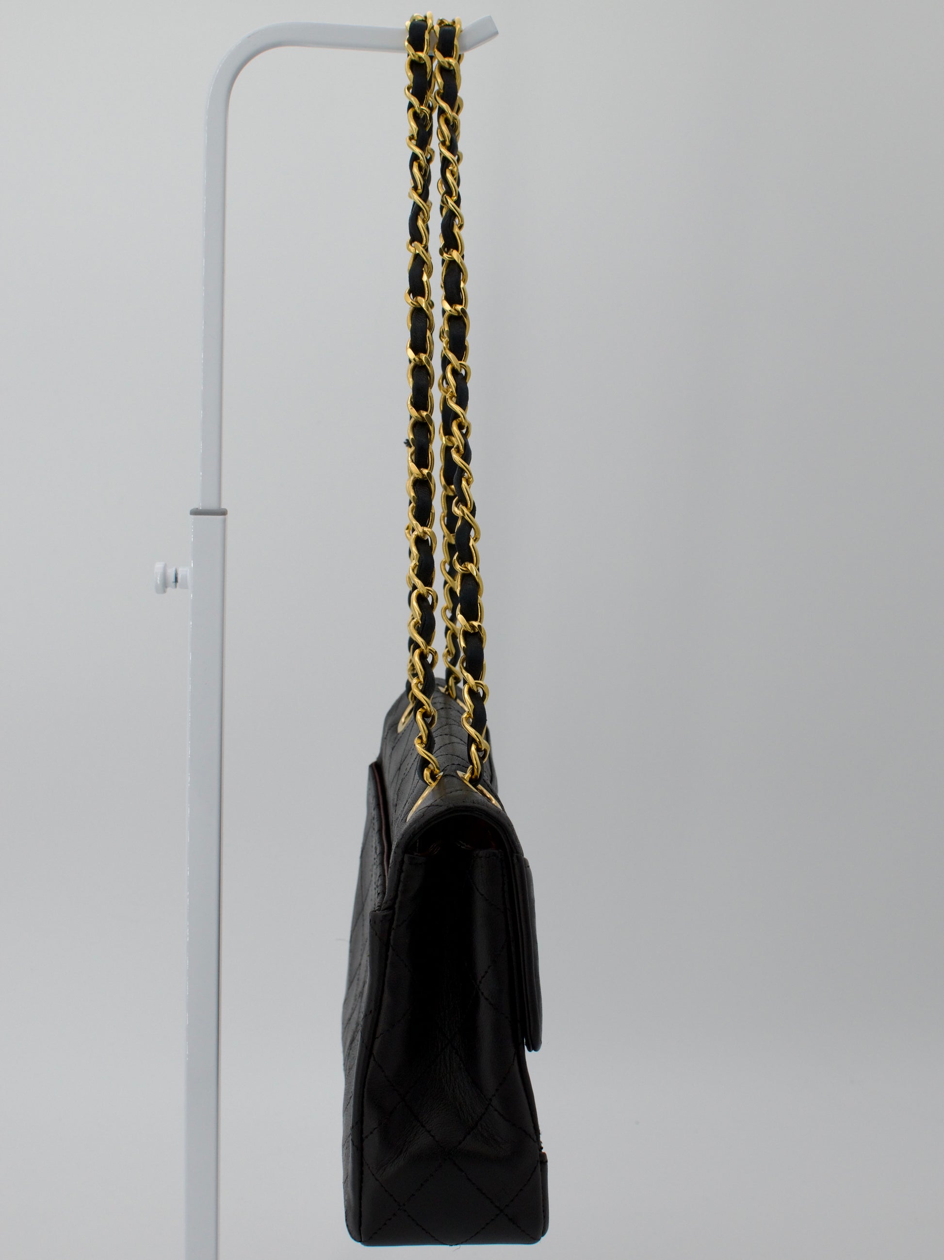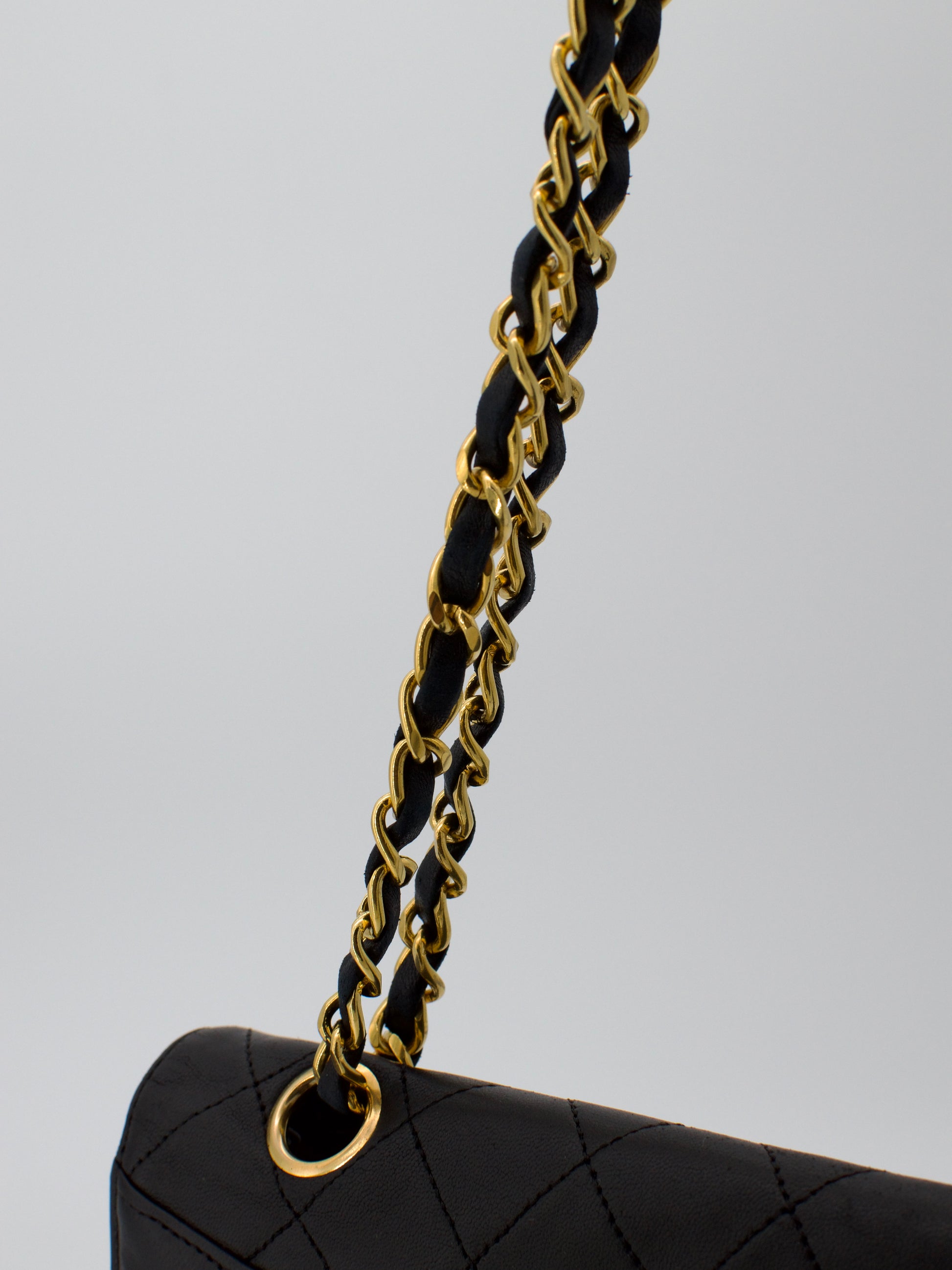 Crafted in supple black lambskin leather with signature diamond quilting, this vintage piece features distinctive details no longer found in current production—smooth leather piping along the flap edges and an exterior back pocket.