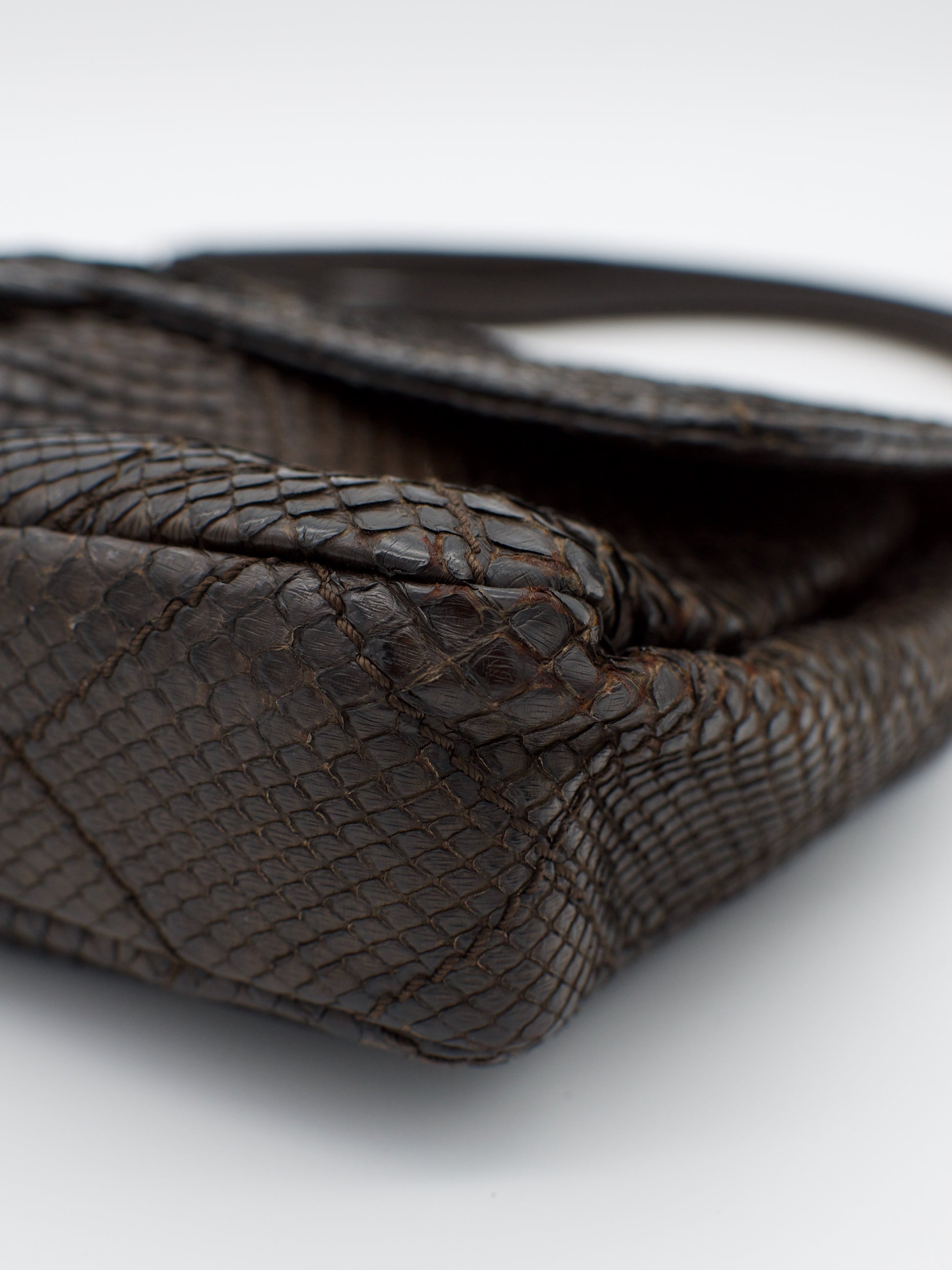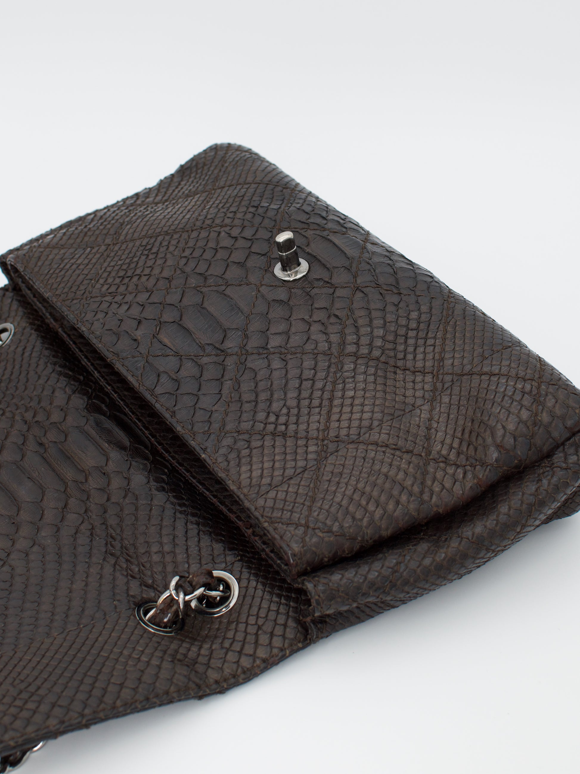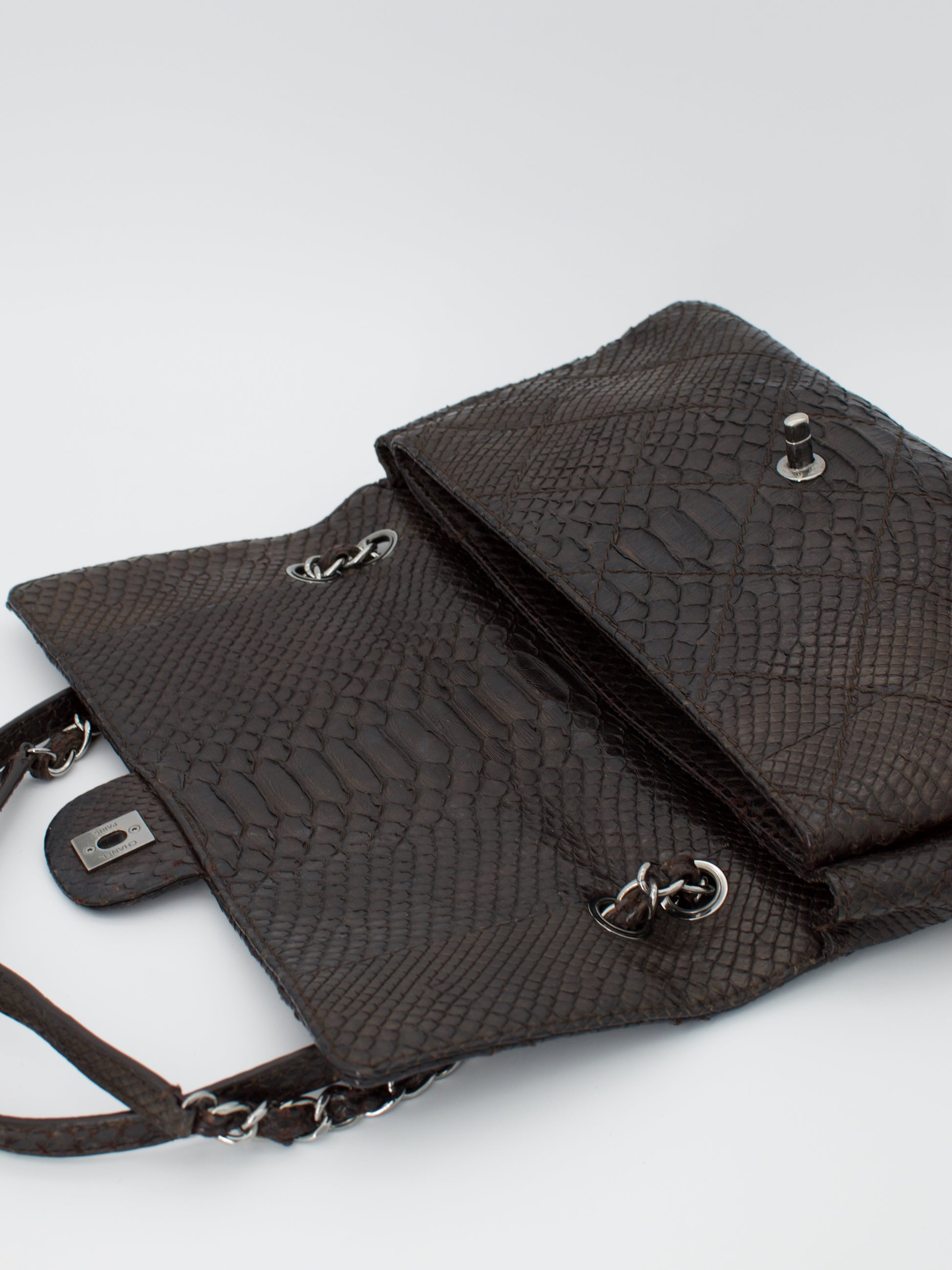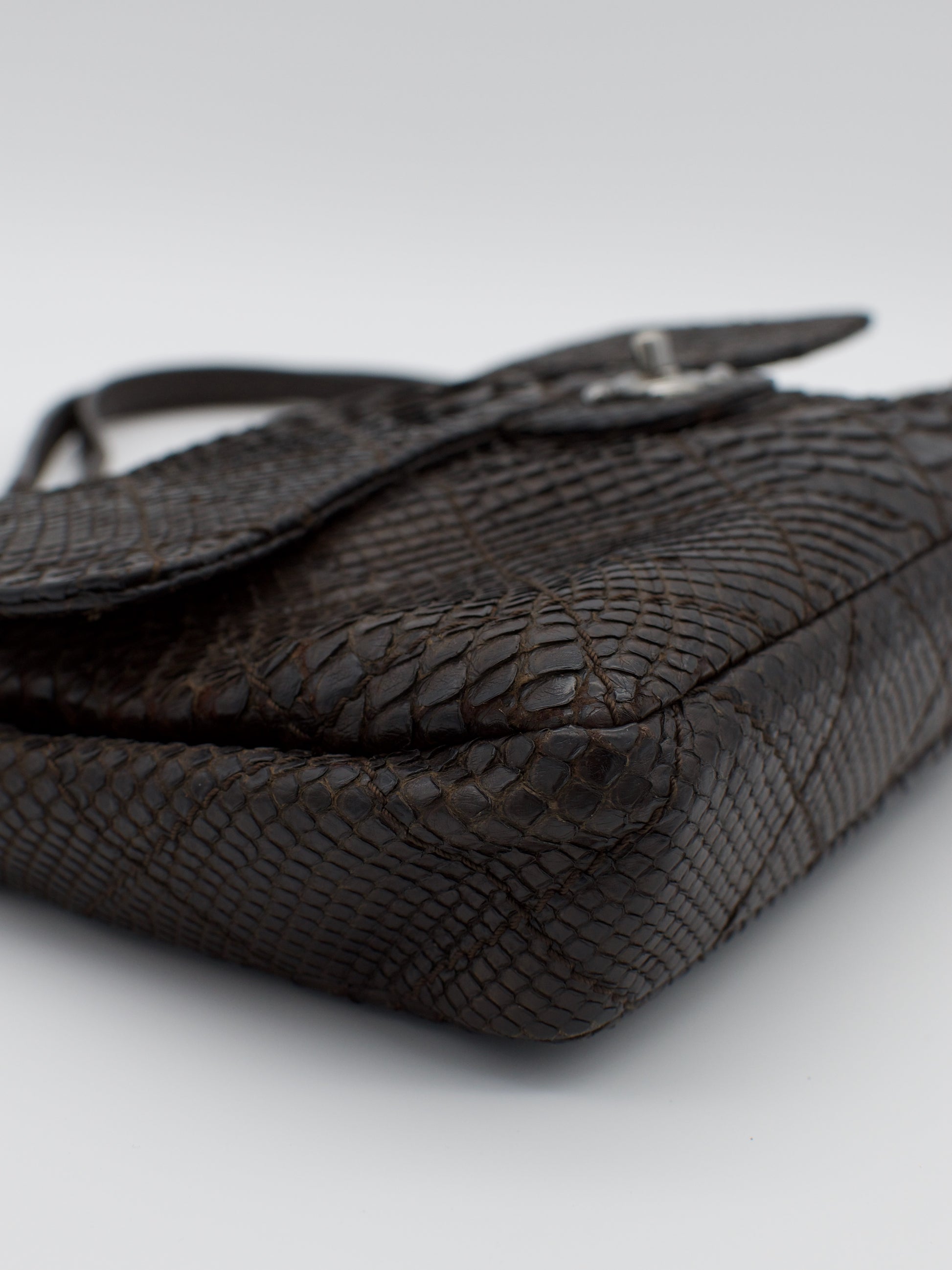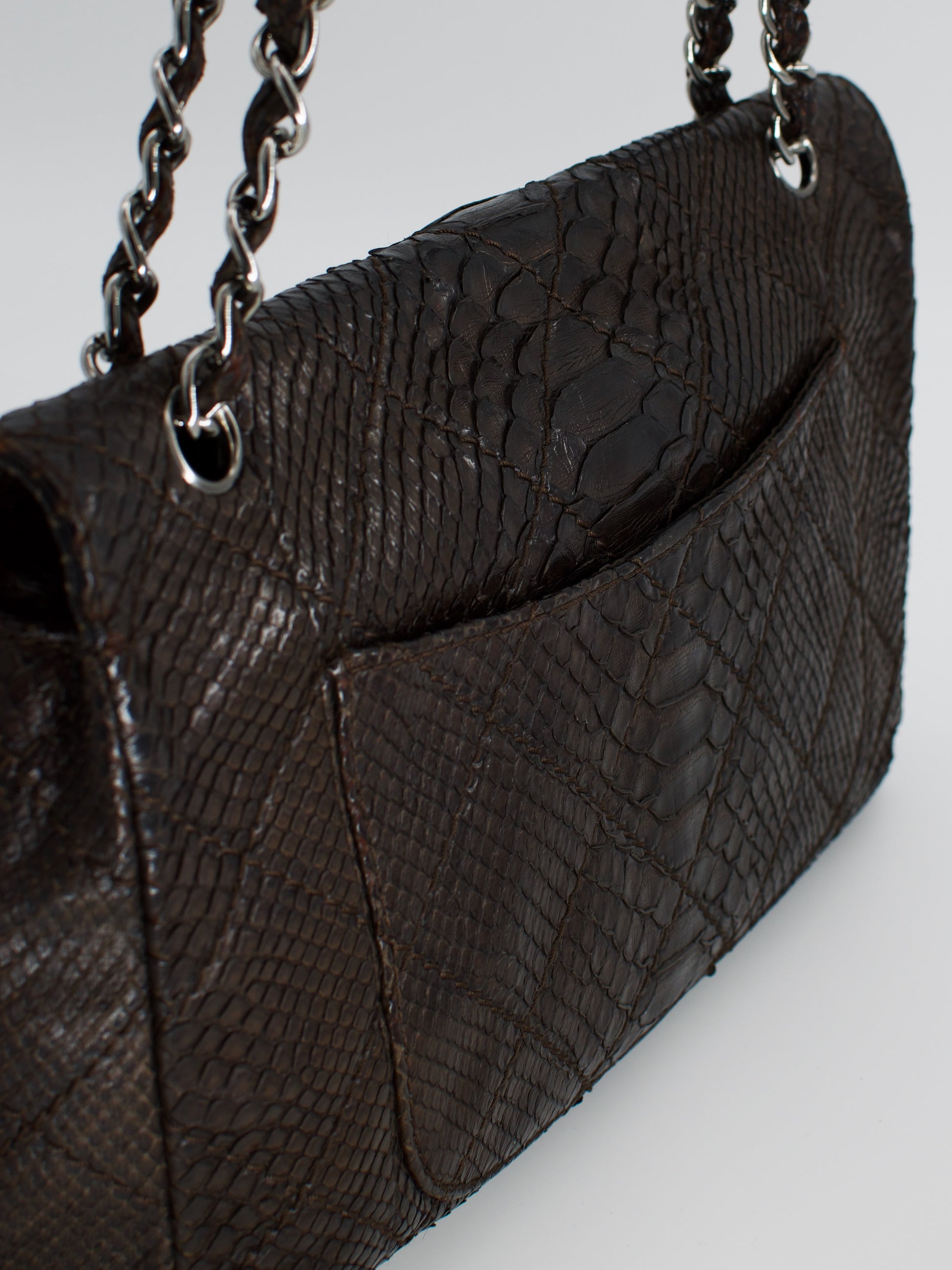 This espresso brown 2011 Rare Seasonal Release Exotic Python Chanel Flap is a true collectors piece. One thing to note about the construction of this bag is that the large scales have been placed directly down the center of this bag, and traditionally, most exotic classic flap bags have a seam down the center. The interior is fully lined in a brown satin silk with silver hardware that matches the turn lock and chain on the exterior. The straps are slightly different than normal Chanel Python bags making this bag even more exotic. They are partially traditional threaded python leather with chain but then switch to full python leather!