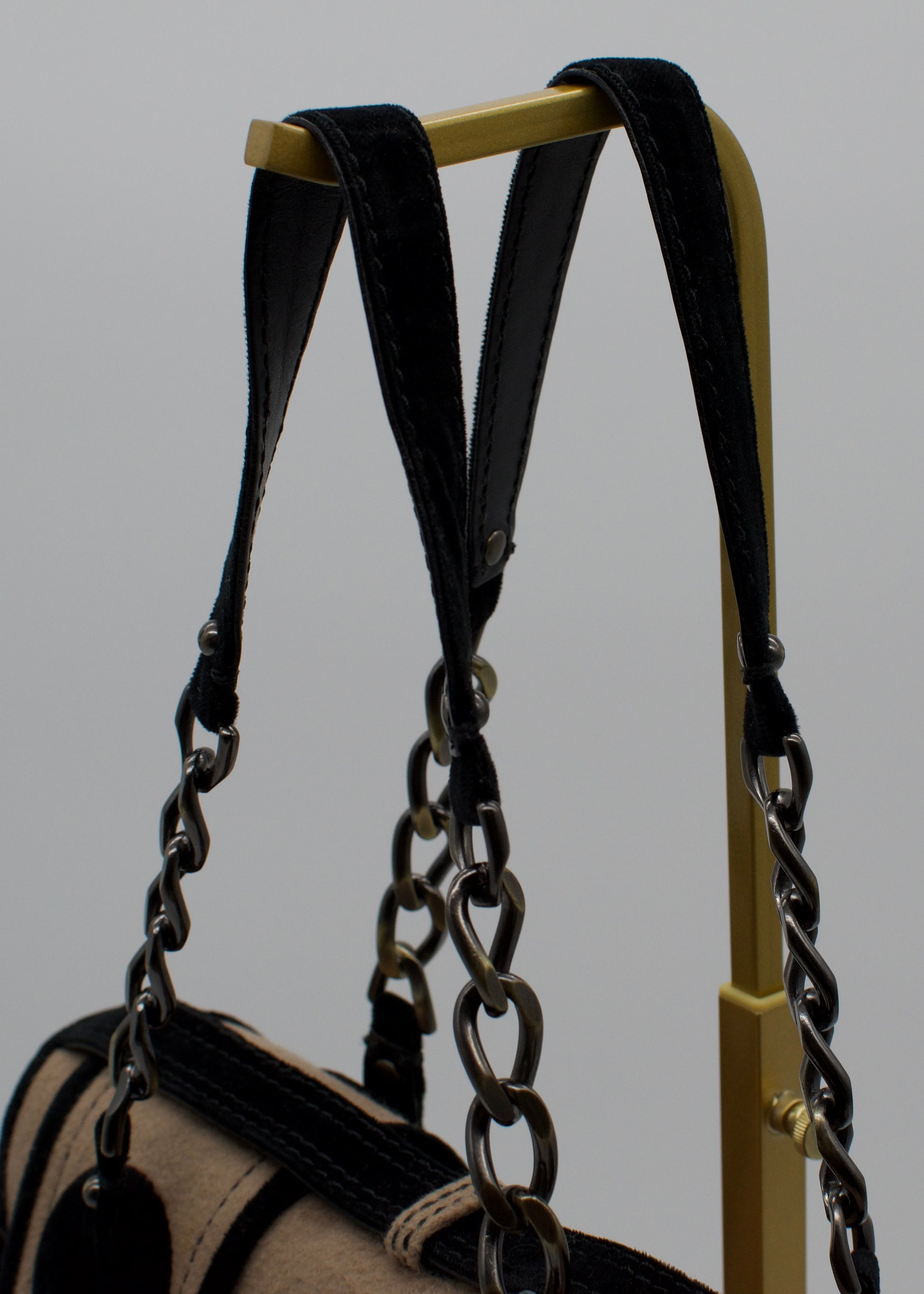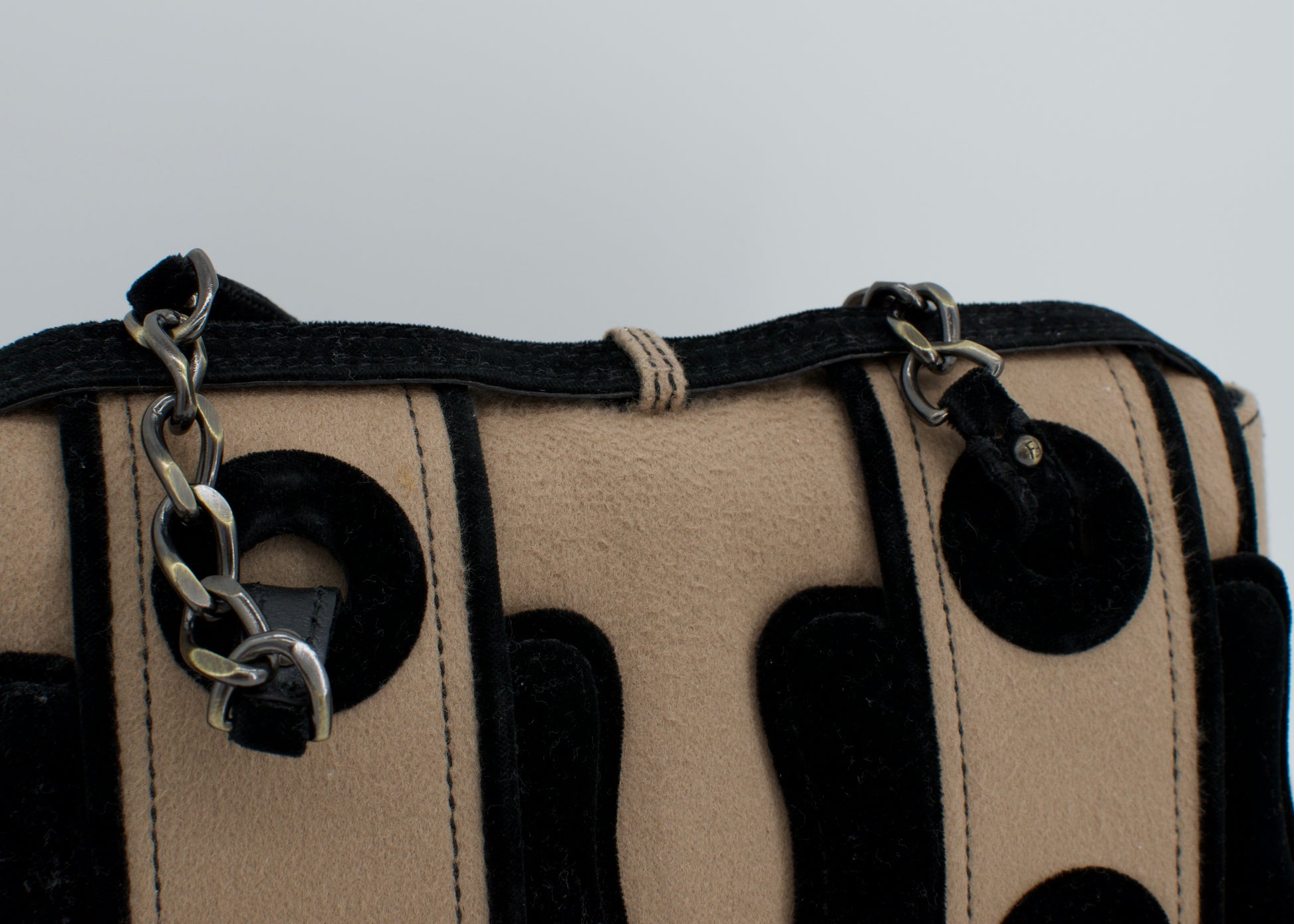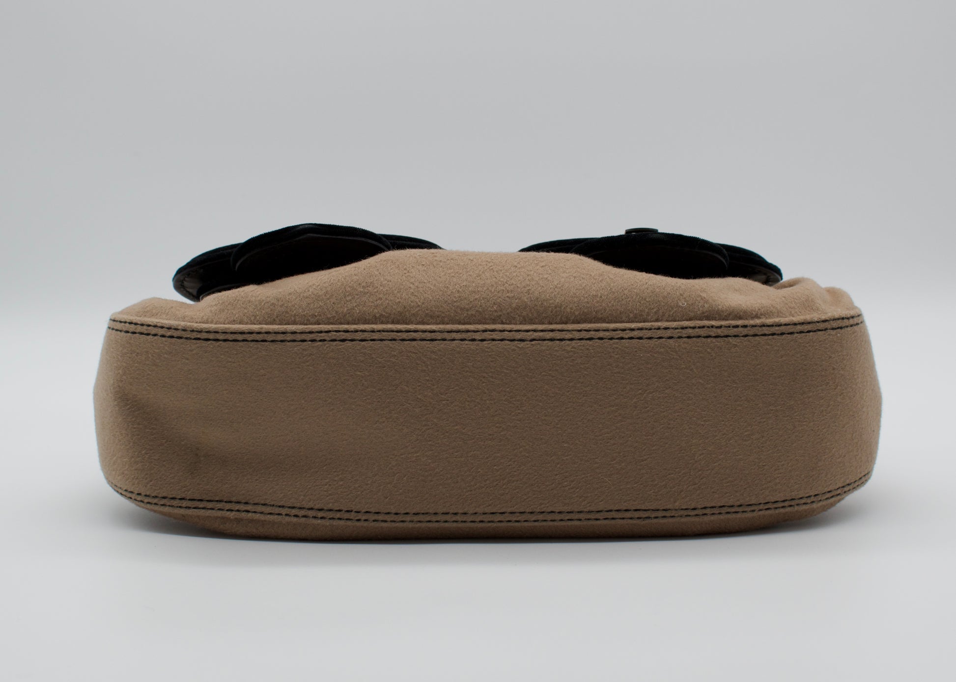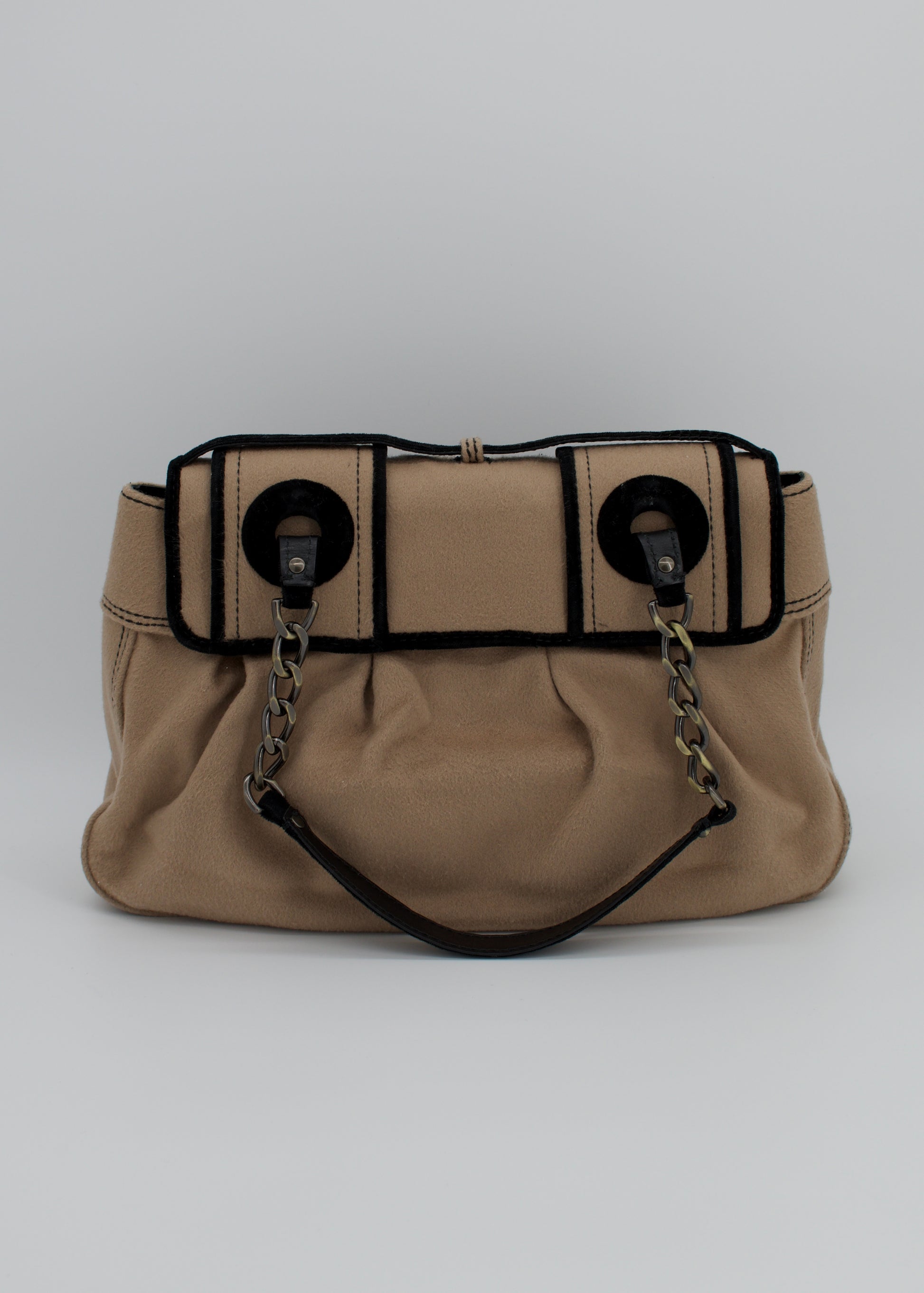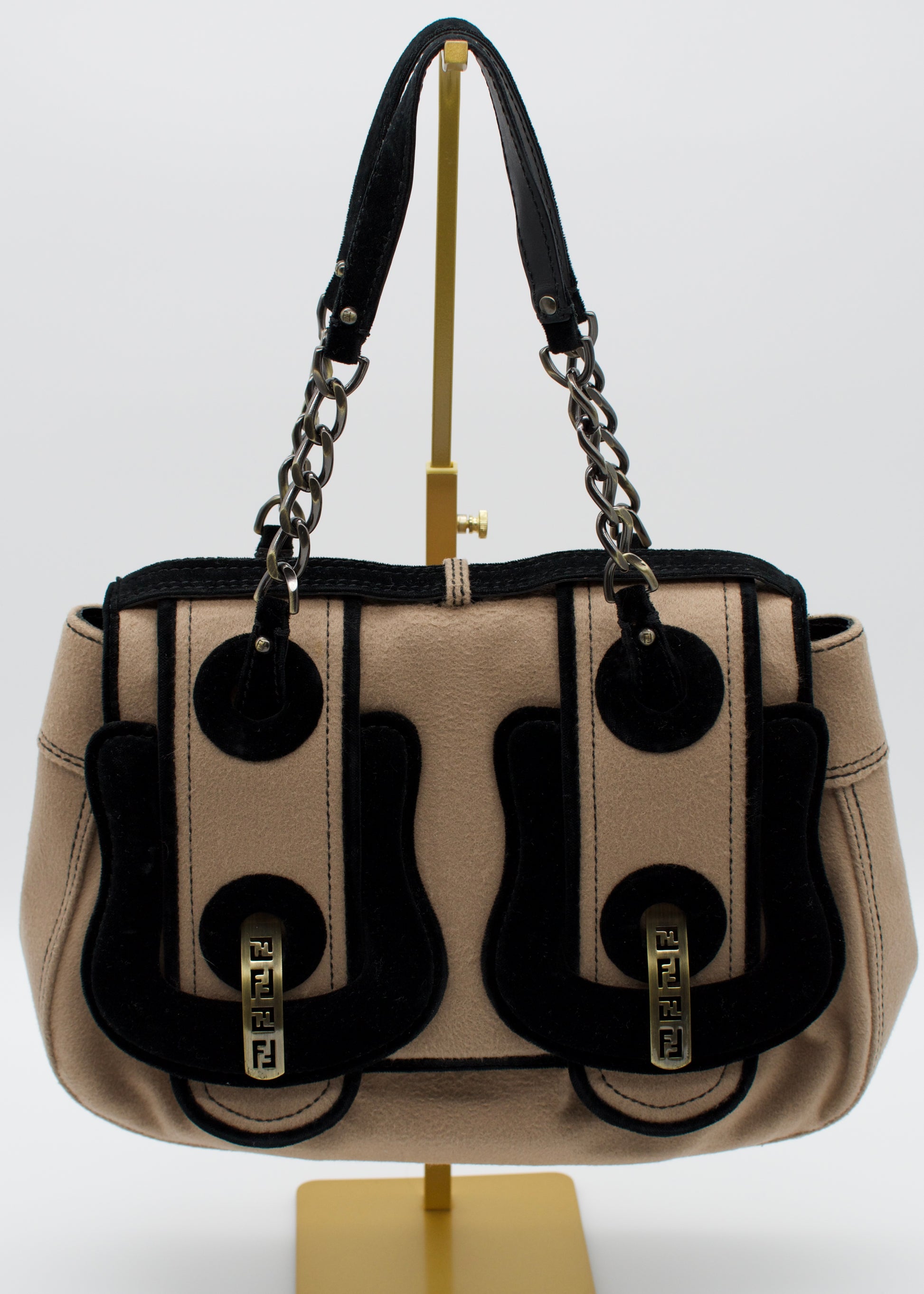 Bold elegance meets textural intrigue in this rare pre-owned Fendi Cashmere B Shoulder Bag. Featuring lux camel color cashmere with velvet accents, this shoulder bag is adorned with the signature Fendi double-buckle hardware and chain-link shoulder straps. Its streamlined silhouette is both practical and high-fashion, perfect for carrying essentials with effortless refinement. An edgy accessory that has a unique style perfect for wearing day or night.