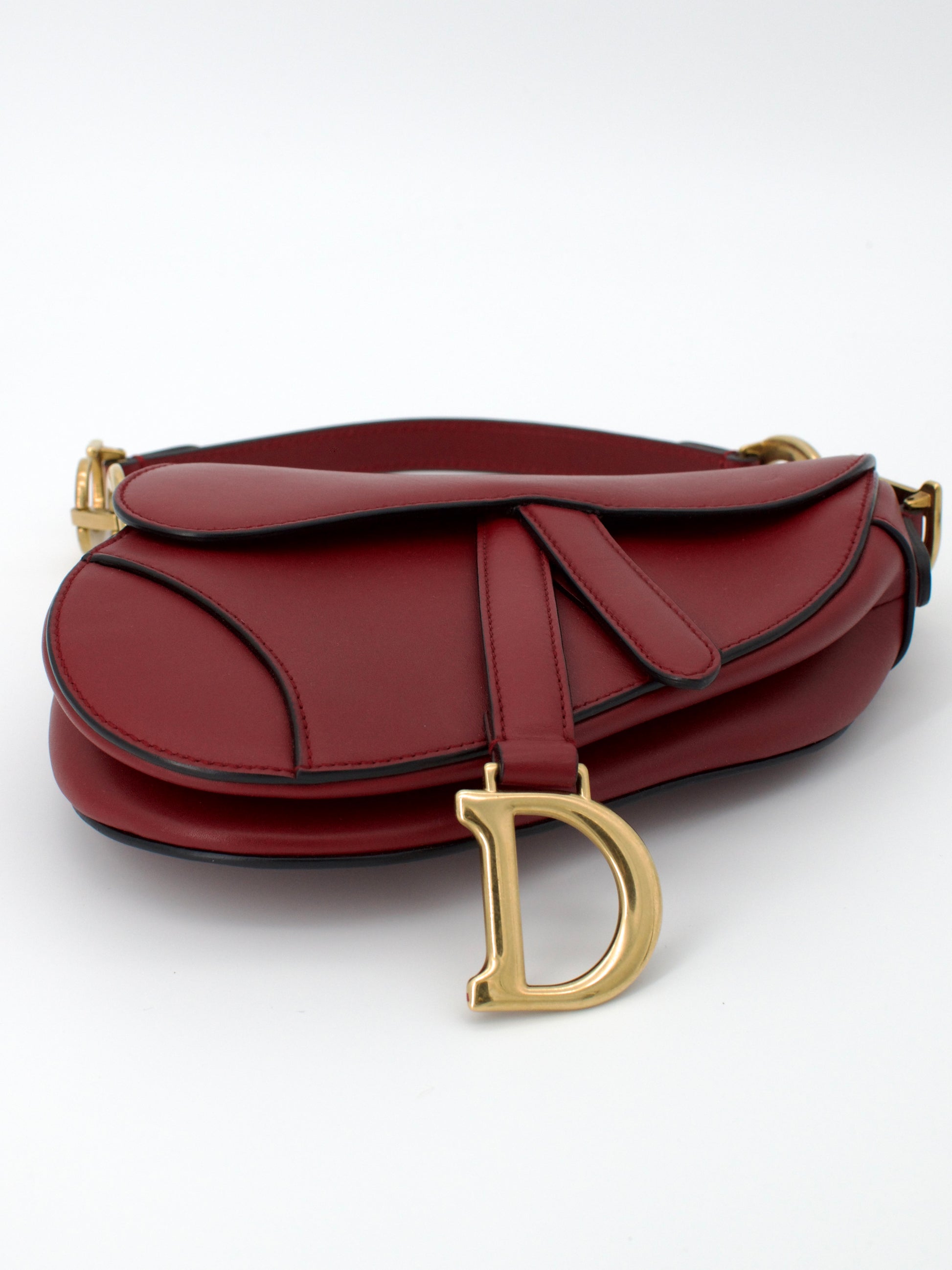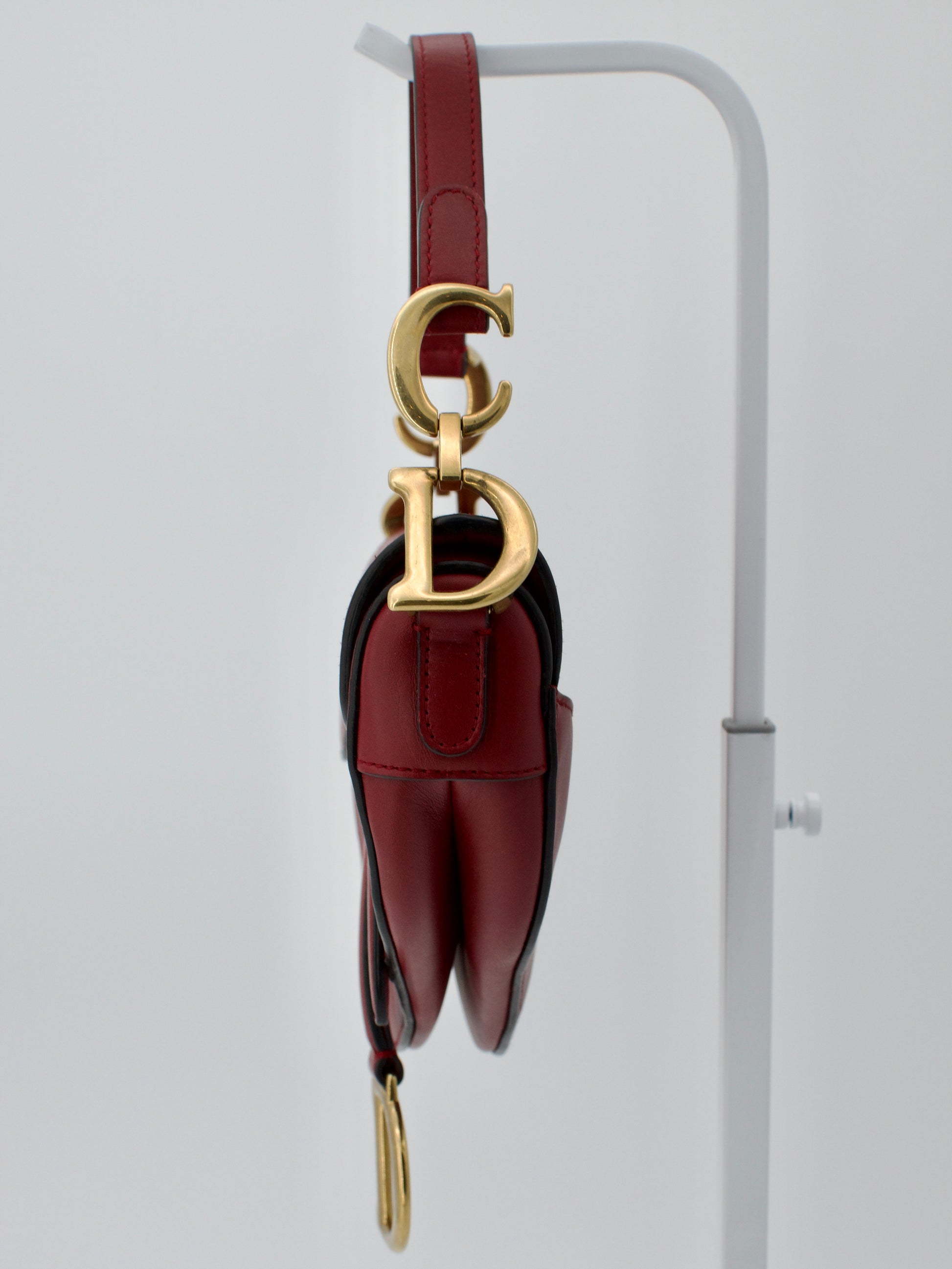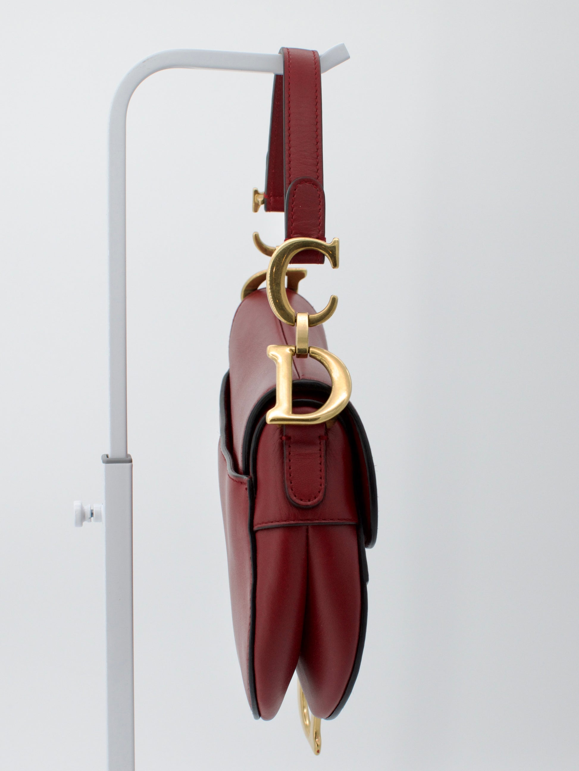A rare early-2000s Mini Dior Saddle Bag, crafted in smooth burgundy calfskin leather and finished with classic gold-tone hardware. This compact version of the iconic Galliano-era Saddle is highly sought after for its sculpted shape, statement “D” charm, and collectible Y2K silhouette.