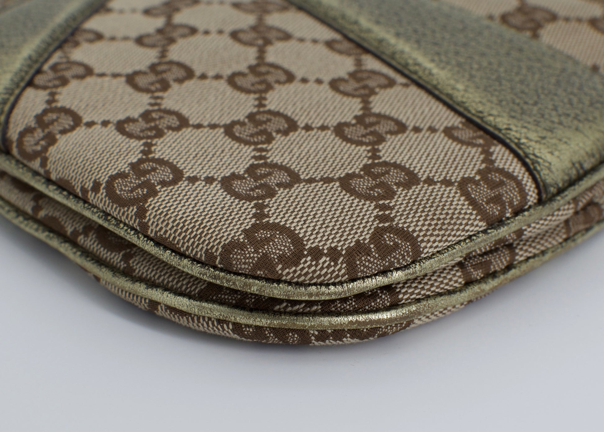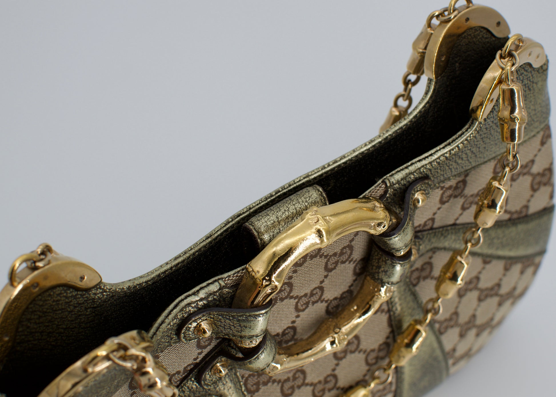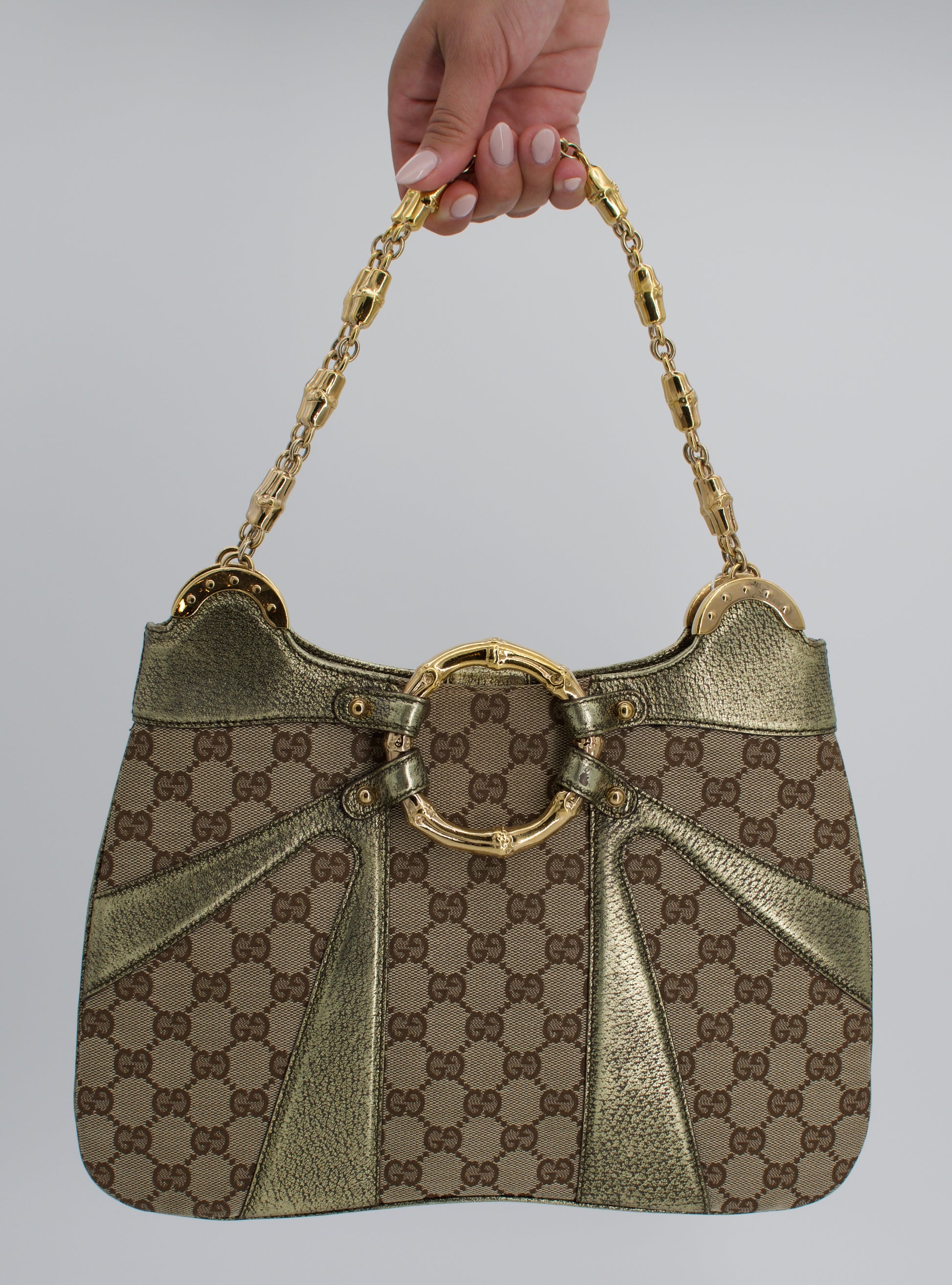 Step into a moment of high-fashion history with this rare, era-defining vintage Metallic Gucci Monogram Bamboo Chain Tom Ford Shoulder Bag. This is not merely a handbag—it is a statement piece and a collector's treasure. Crafted from shimmering metallic-coated canvas adorned with the iconic GG monogram, this piece exudes a sleek confidence, perfect for both modern minimalism and retro glamour.